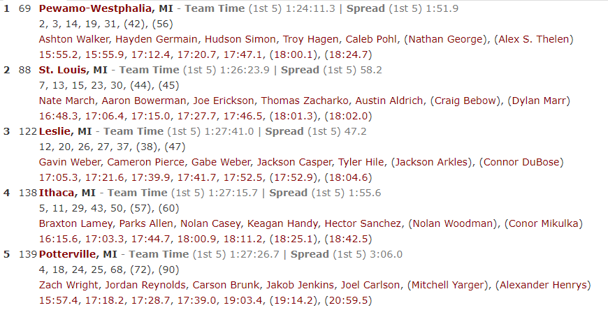 | Pewamo-Westphalia | 5 | 7 | 11 | 16 | 18 | 20 | 23 |