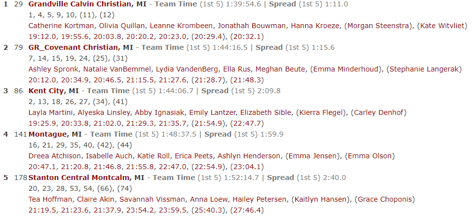 | 1 | 1 | 11 | Catherine Kortman | Grandville Calvin Christian | 137.1 |