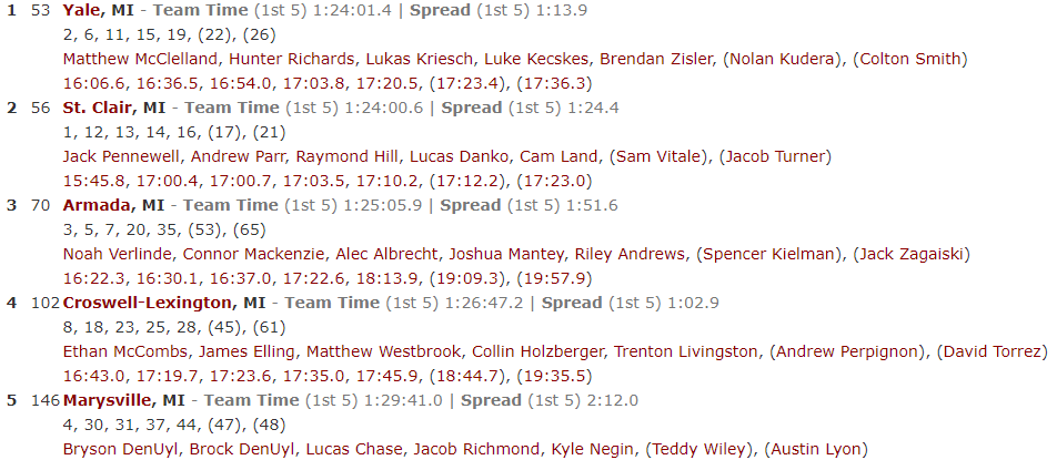 | Imlay City | 8 | 15 | 19 | 29 | 33 | 47 | 49 |