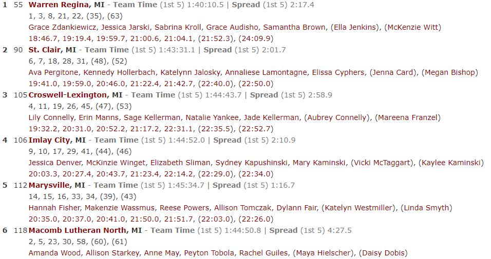 | Macomb Lutheran North | 2 | 6 | 18 | 30 | 56 | 57 | 59 |