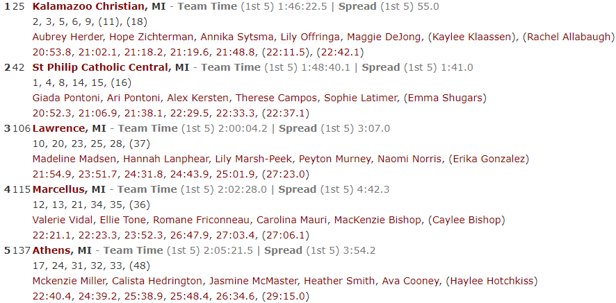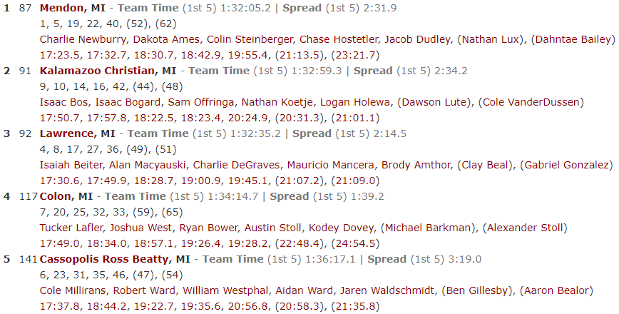 | Kalamazoo Christian | 7 | 9 | 13 | 15 | 39 | 40 | 42 |