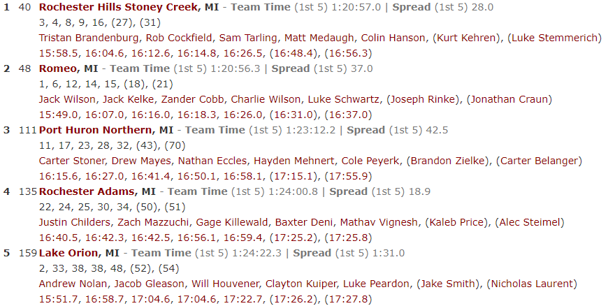 | 5 | 5 | 12 | Carter Stoner | Port Huron Northern | 195.3 |