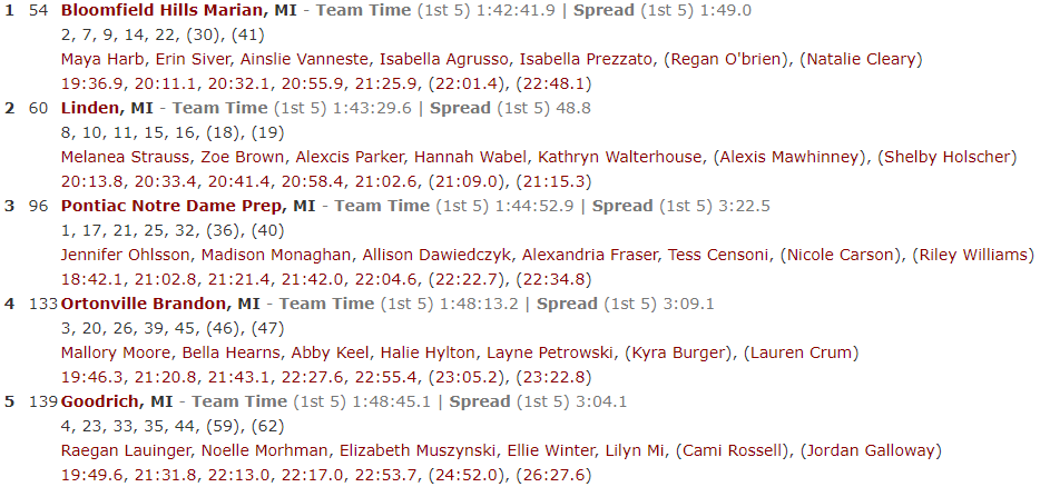 | Bloomfield Hills Marian | 2 | 7 | 9 | 21 | 34 | 36 | 41 |