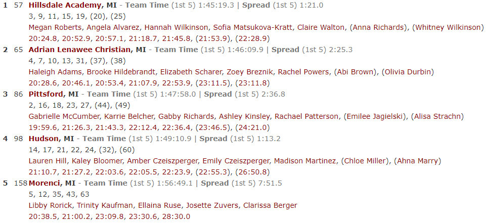 | 10 | 10 | 10 | Elizabeth Scharer | Adrian Lenawee Christian | 101.7 |