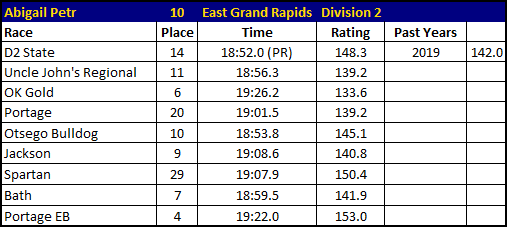 - Showed some improvement in indoor, sporting a 3 second PR in the 3200m, one that we know from EGR’s history that would drop in the spring