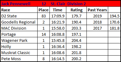 He turned that into some blazing performances, going sub-16 at both Eastwood Beach and Wagener Park (and funnily, in conversation with his coach last summer, I predicted he’d be 15:45 at an Algonac… close)