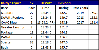 Her junior year was remarkably consistent, the only races that could be called subpar would be Portage and Spartan, those two were both sub-19 efforts by their ratings