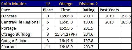 In the more competitive meets later in the year, he was reliably around the 16:00 range, dipping under it at Portage and Otsego Bulldog (and an equivalent performance at MIS)