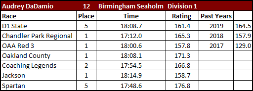 Her season in Michigan wasn’t too shabby either – Oakland County Champ, OAA Red Champ, All-State, and numerous sub-18 performances