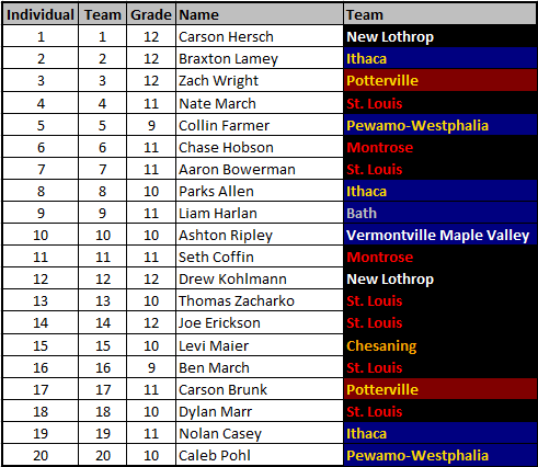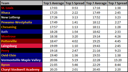 Despite their youth last year, St. Louis was able to string together TVC and Regional titles, then follow those accomplishments up with a top-10 finish in Brooklyn. Ithaca and New Lothrop were similarly youthful, but neither bring in a freshman such as Ben March. Pewamo-Westphalia always finds a way to throw themselves into the mix as well, New Lothrop’s key to holding them off may be Drew Kohlmann, who was able to put it together late last season.