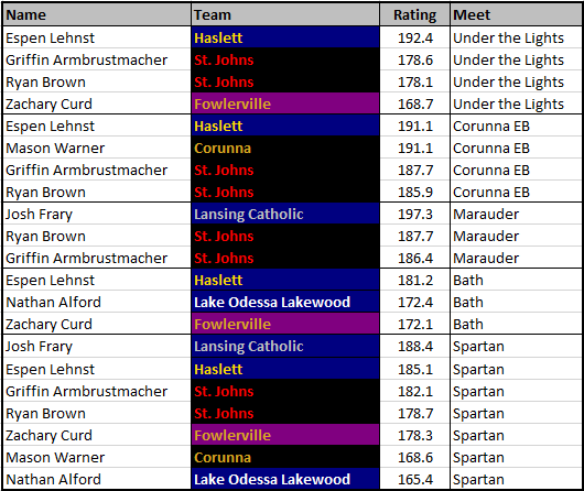 St. Johns success is dependent on their ability to pack up. Just take a look at the 1-5 spread projected above. Runners such as Ryan play a role in that. His consistency (his ratings were all between 178-185) and his ability to step up in important races (ran his best at regionals) will aid the Redwings down the stretch.