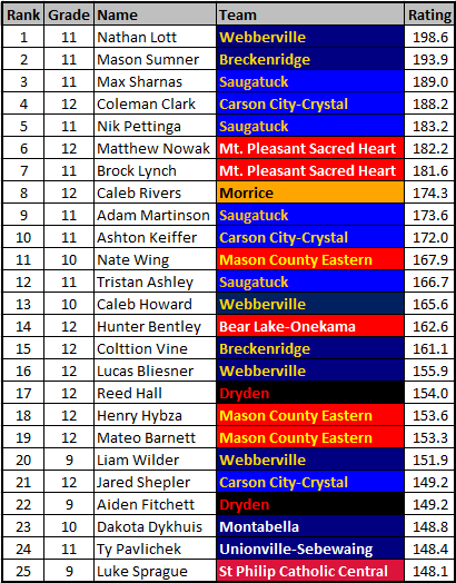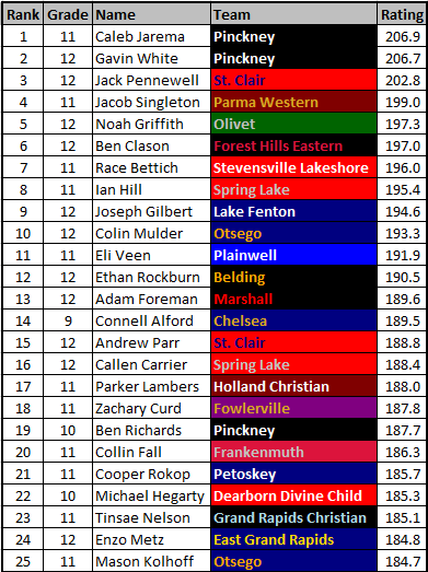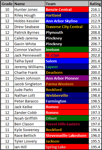 - The individual rankings are based on a weighted average of all races rated. Hobbs Kessler owns the best individual performance thus far, but his dual against Allen Park is lower, resulting in Hunter Jones taking the top spot. This is the method I’ve used for the past 2 years.