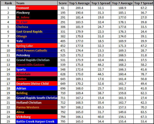 • Top 5 Average is average ratings of a team’s top 5 runners, Top 5 Spread is the difference between their 1st and 5th, and so on.