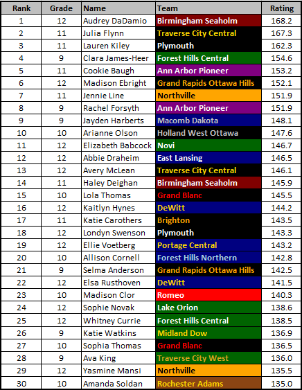 Currently there are about 5500 boys and 5000 girls with ratings this season. I’d estimate that’s about 80% of the state.