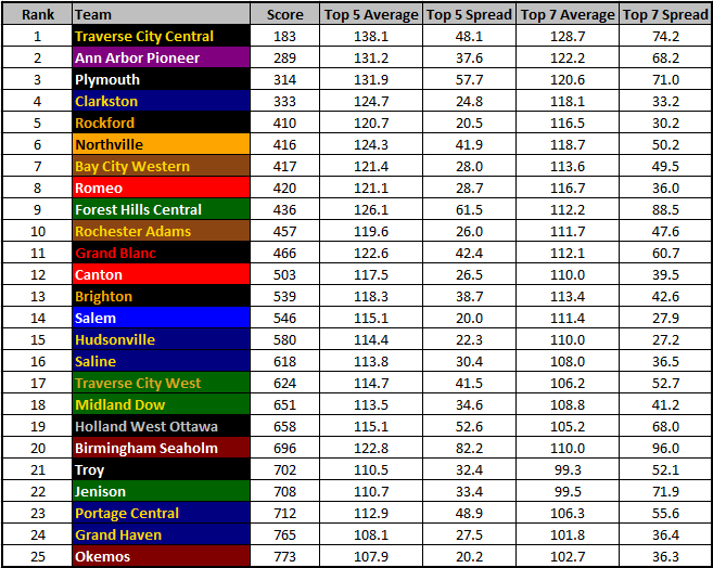 Top 5 Average is average ratings of a team’s top 5 runners, Top 5 Spread is the difference between their 1st and 5th, and so on.