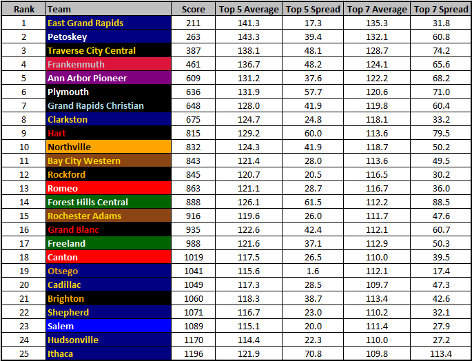 Top 5 Average is average ratings of a team’s top 5 runners, Top 5 Spread is the difference between their 1st and 5th, and so on.