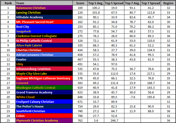 Top 5 Average is average ratings of a team’s top 5 runners, Top 5 Spread is the difference between their 1st and 5th, and so on.
