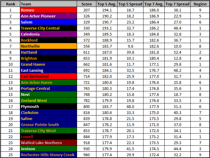 Top 5 Average is average ratings of a team’s top 5 runners, Top 5 Spread is the difference between their 1st and 5th, and so on.