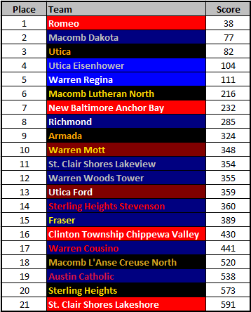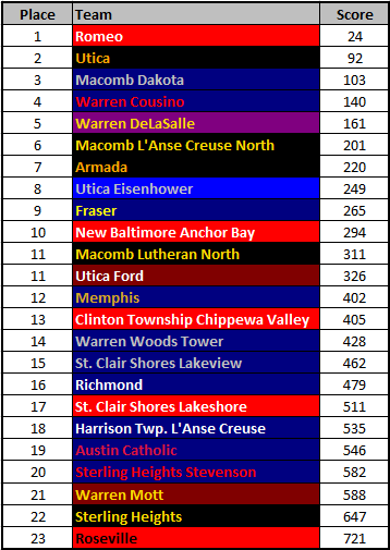 Romeo – Winners of the MAC Red and Hansons Invitational. Ranked #1 in Division 1, looking to be the first Macomb County school to win a state title since the 80’s.
