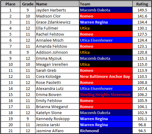 Romeo – Finished 9th as a team in Division 1 last year and is right in the mix again this year. Winner of the MAC Red Meet and 2nd to a strong Northville team at Hansons.