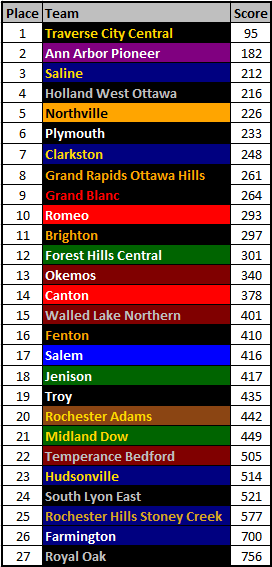 Highland-Milford is the toughest team to judge in the field. They bested quality squads such as Novi and Stoney Creek at Oakland County. The Mavericks have made it here, although it doesn’t appear they’ve raced with the same vigor in the past few meets. At their best, Milford was around 6 sec./runner better than Stoney and 8 sec./runner better than Novi. Romeo has been 15-18 sec./runner better than Stoney and Salem has been 12 sec./runner better than Novi.
