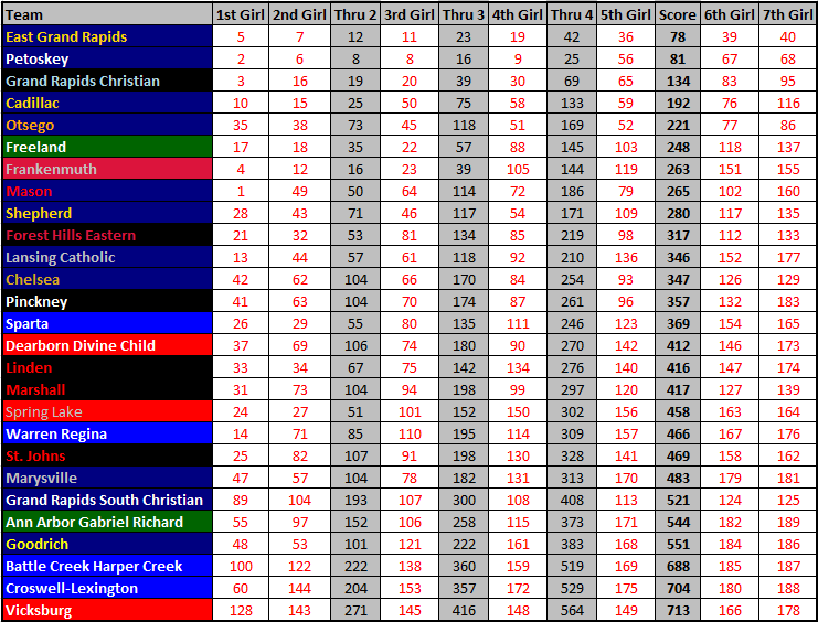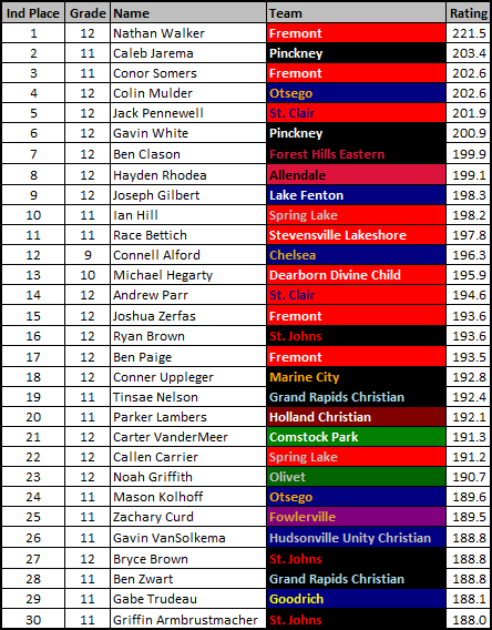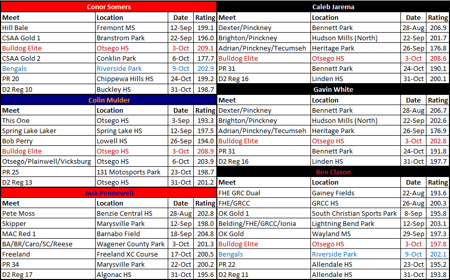 There are other teams, of course. Cadillac may be vastly underrated by these numbers. They’ve been greatly enhanced by the re-emergence of Kendall Schopieray. Grand Rapids Christian has reloaded behind Frens with freshman such as Natalie VanOtteren. And finally, Otsego came out of nowhere last year to finish 3rd. The Bulldogs have taken pack running to an extreme this year and have the ability to place 5-6 girls in front of many rivals’ 3rd or 4th.