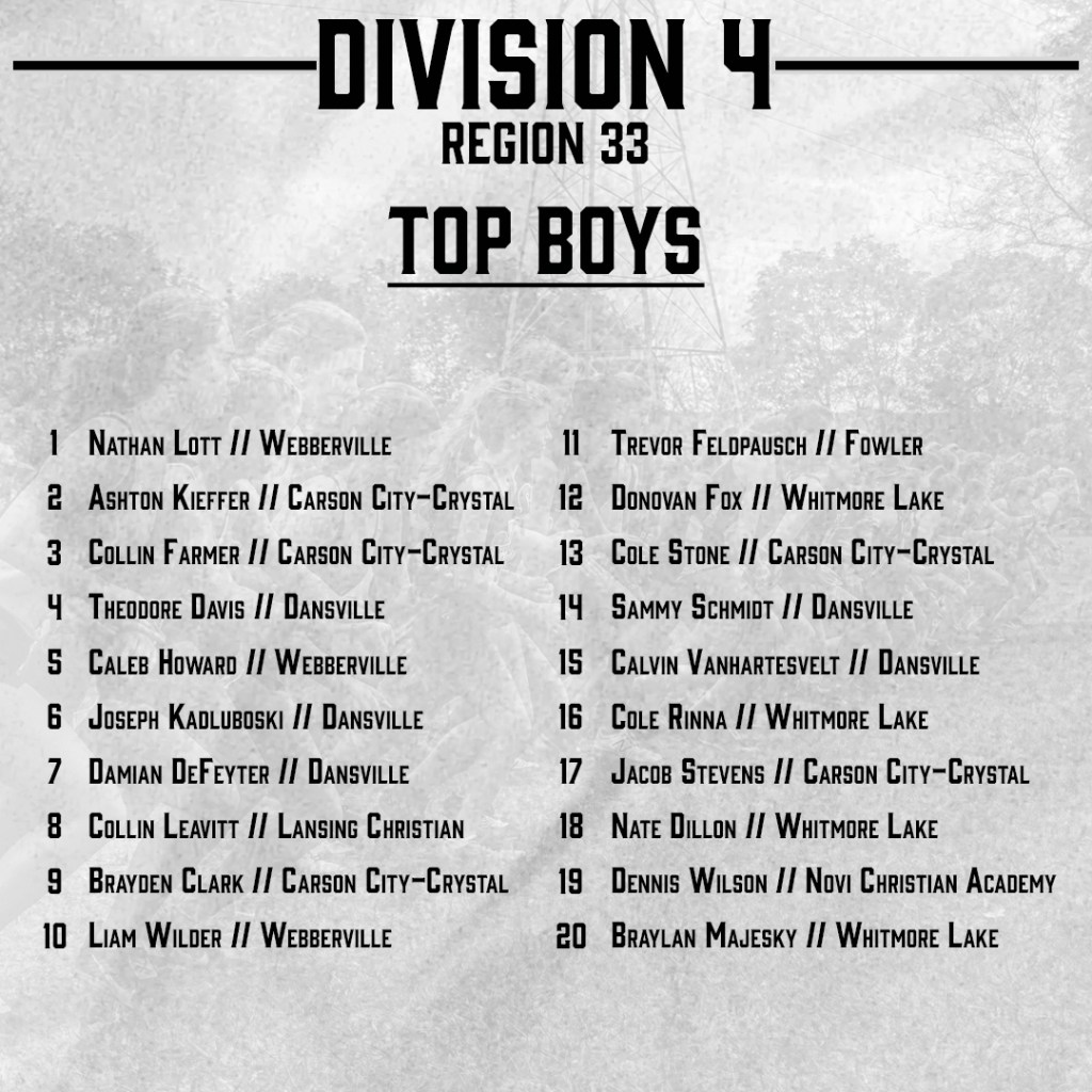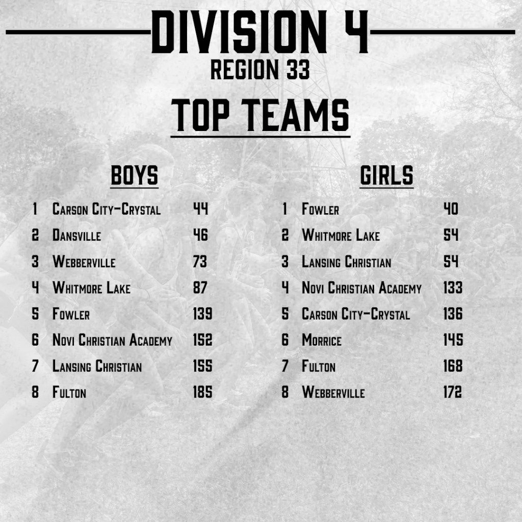 Top 25 Boys Teams: Carson City-Crystal (Top 10), Dansville (Top 10), Webberville (12), Whitmore Lake (14)