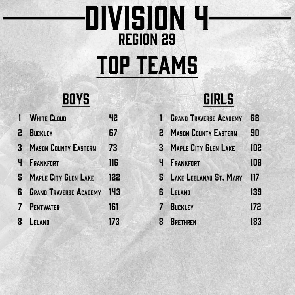 Top 25 Boys Teams: White Cloud (Top 10), Buckley (13), Mason County Eastern (15)
