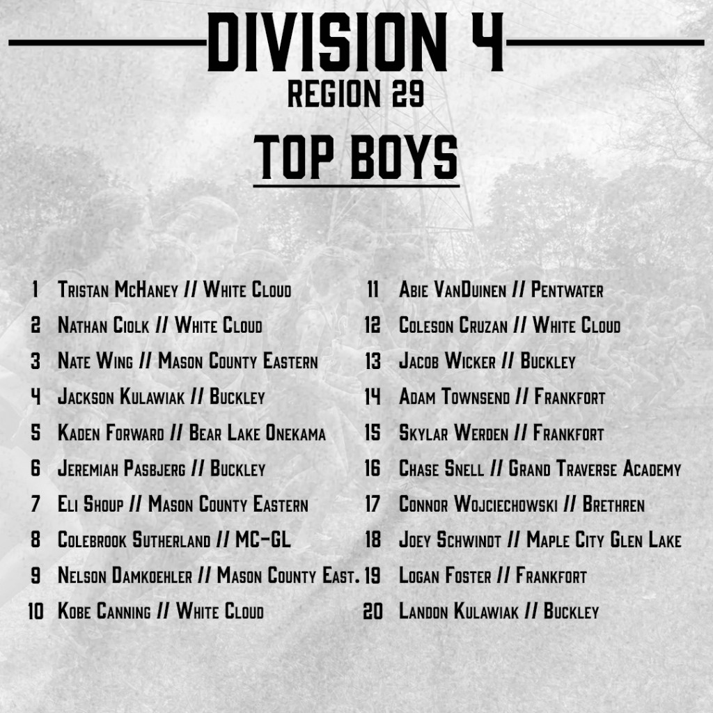 Top 50 Boys (Division 4): Tristan McHaney (23), Nathan Ciolk (24), Nate Wing (26), Jackson Kulawiak (36), Kaden Forward (41), Jeremiah Pasbjerg (48)