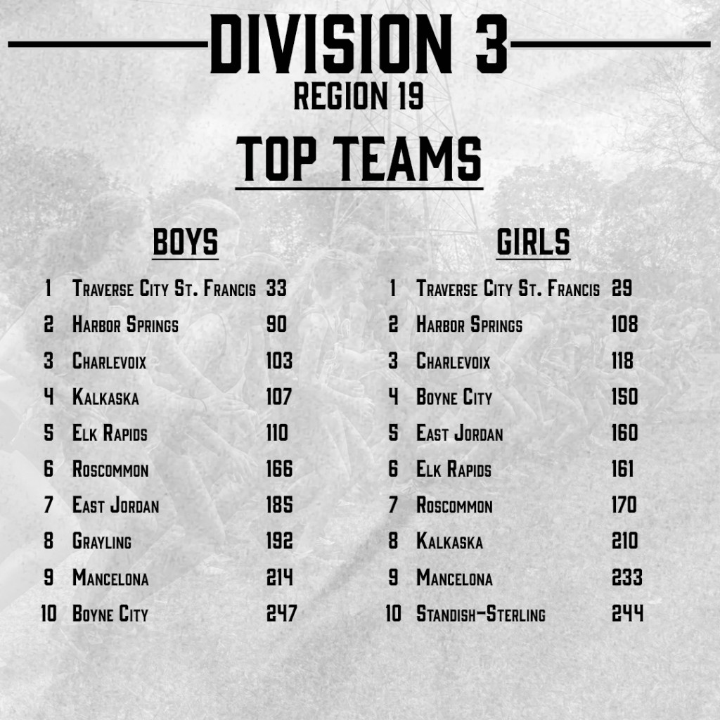 Top 25 Boys Teams: Traverse City St. Francis (Top Ten), Harbor Springs (11), Charlevoix (12), Elk Rapids (19), Kalkaska (24)