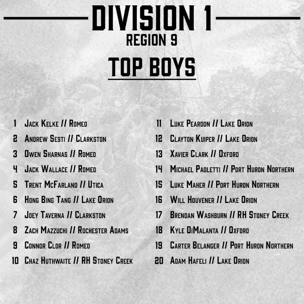 Top 50 Boys (Division 1): Jack Kelke (4), Andrew Sesti (5), Owen Sharnas (14), Jack Wallace (38)