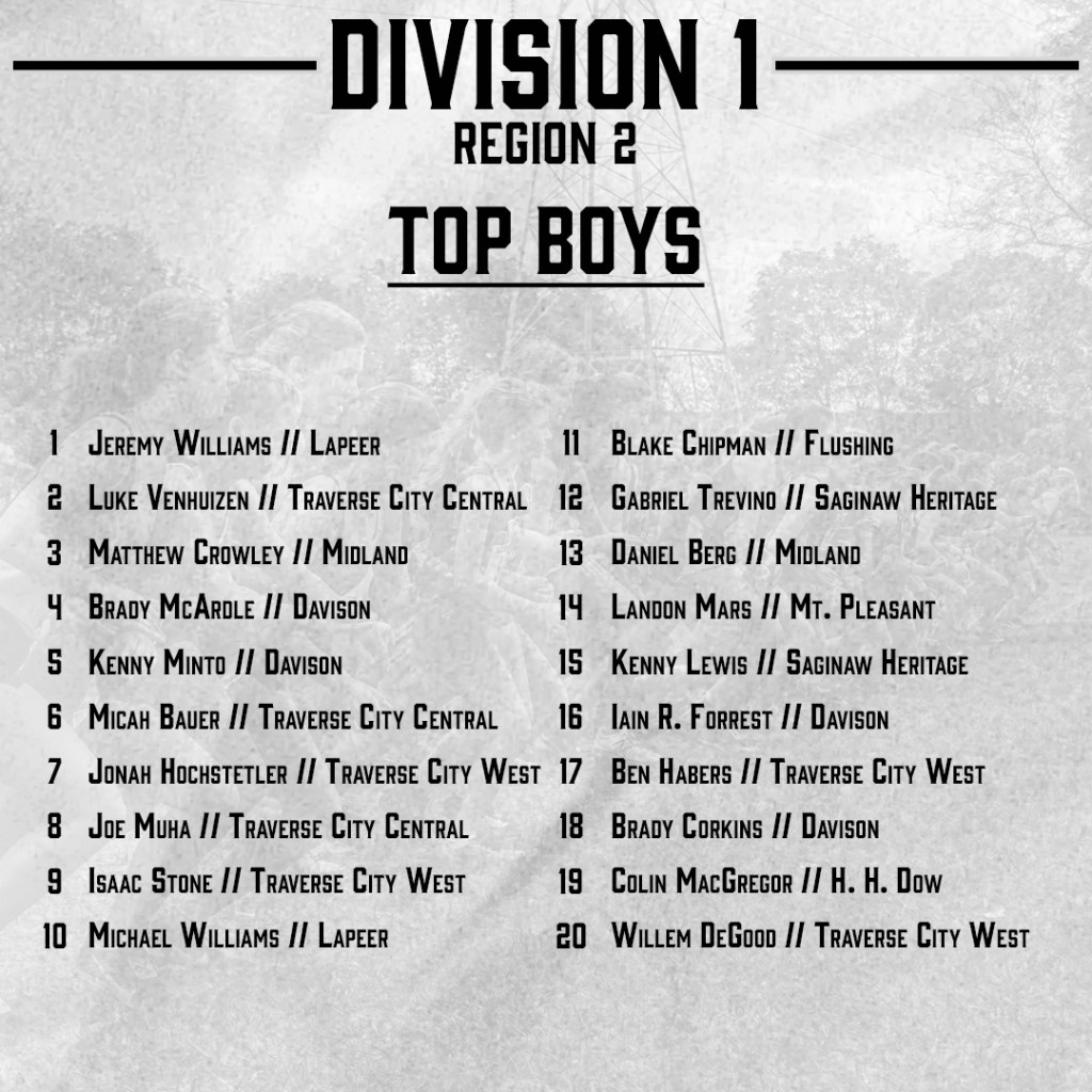 Top 50 Boys (Division 1): Jeremy Williams (3), Luke Venhuizen (6), Matthew Crowley (10), Brady McArdle (12), Kenny Minto (15), Micah Bauer (28), Jonah Hochstetler (36), Joe Muha (37), Isaac Stone (39)