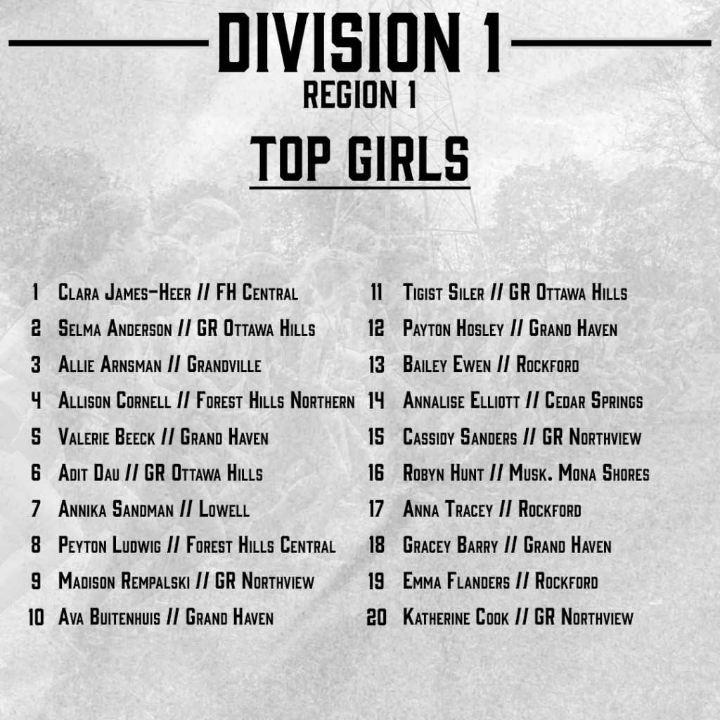 Top 50 Boys (Division 1): Benne Anderson (7), Colin Graham (23), Klay Grant (24), Mitchell Goerge (31), Nolan Clark (32), Zac Zemba (33), Juan David Hernandez (35), TJ Mellema (40), Cole Weston (43)