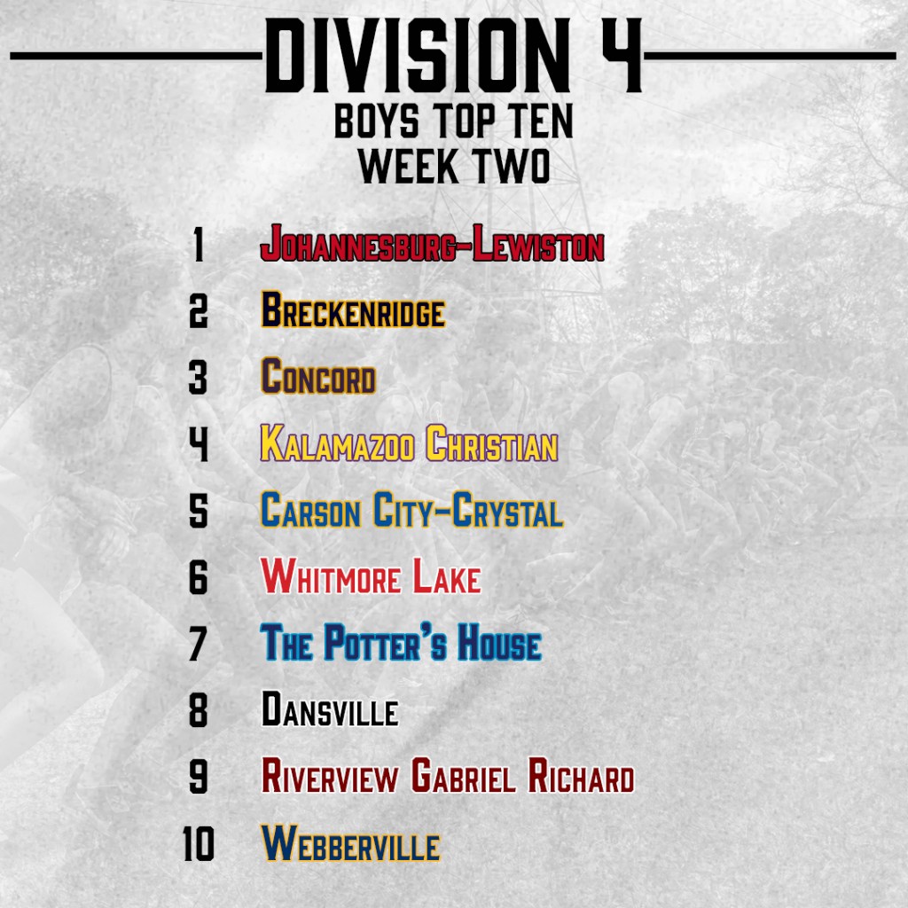 Place Team Score 1 Johannesburg-Lewiston 80 2 Breckenridge 201 3 Concord 269 4 Kalamazoo Christian 271 5 Carson City-Crystal 276 6 Whitmore Lake 337 7 The Potter’s House 347 8 Dansville 397 9 Riverview Gabriel Richard 418 10 Webberville 441 11 Mason County Eastern 451 12 Adrian Lenawee Christian 460 13 Auburn Hills Oakland Christian 473 14 Frankfort 502 15 Petoskey St. Michael 529 16 Marine City Cardinal Mooney 535 17 White Cloud 537 18 Novi Christian Academy 556 19 Lutheran Westland 599 20 Muskegon Western Michigan Christian 619 21 Unionville-Sebewaing 634 22 Fairview 641 23 St. Joseph Lake Michigan Catholic 669 24 Muskegon Catholic Central 682 25 Gobles 698