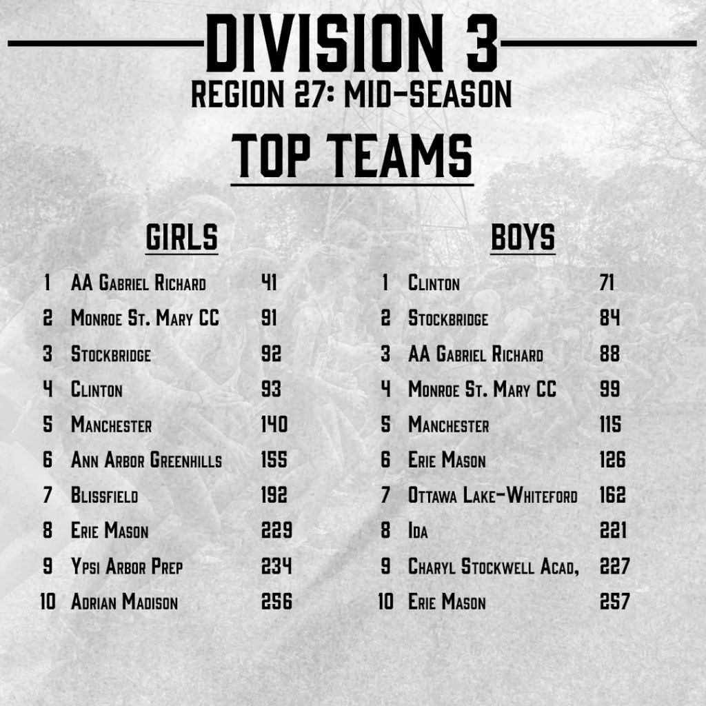 Girls: Ann Arbor Gabriel Richard, Monroe St. Mary Catholic Central, Ann Arbor Greenhills, Erie Mason, Ypsilanti Arbor Preparatory