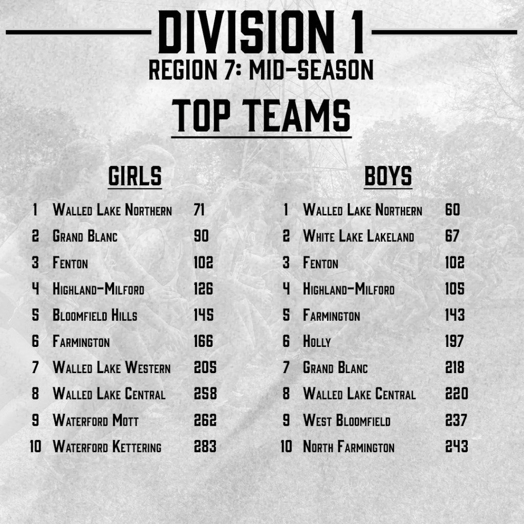 Girls: Walled Lake Northern, Highland-Milford, Bloomfield Hills, Farmington, Walled Lake Central, Waterford Mott, Waterford Kettering, Holly, North Farmington, Orchard Lake St. Mary’s