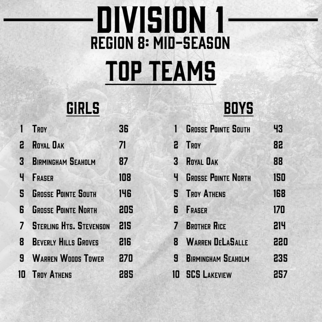 Boys: Troy, Grosse Pointe North, Troy Athens, Fraser, St. Clair Shores Lakeview, L’Anse Creuse, Warren Woods Tower