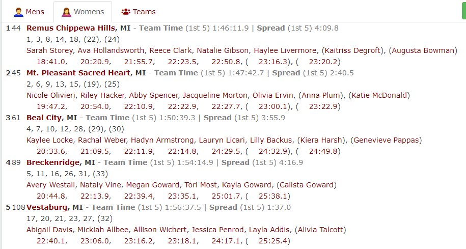 | 12 | 12 | Abby Spencer | Mt. Pleasant Sacred Heart | 61.2 |