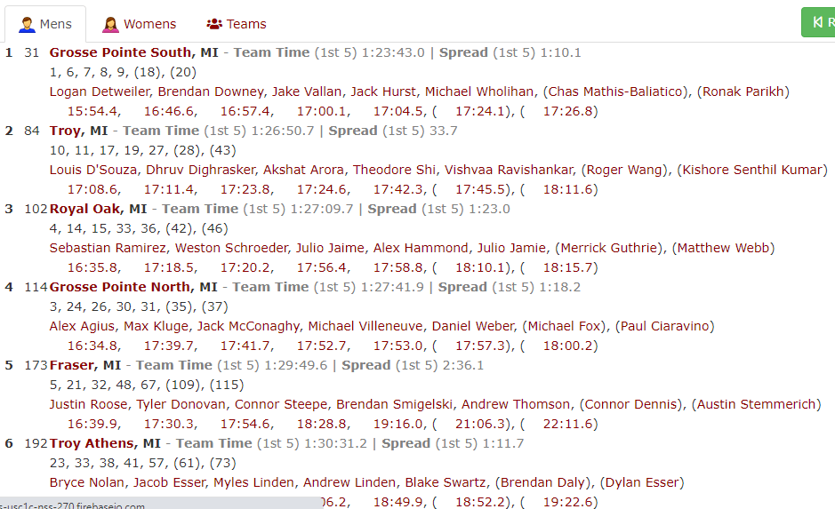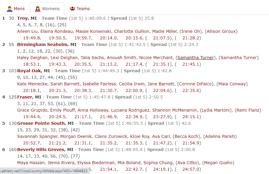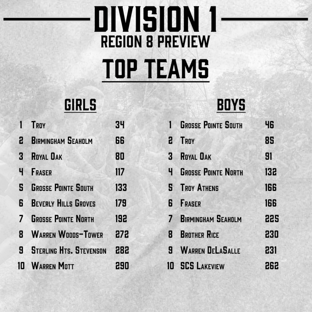 What to Watch For: Haley Deighan’s return. Okay, I know this is a bit of pressure going straight to an individual. So is returning with three races to go, your first race back being a championship race in one of Michigan’s tougher conferences. Clintonwood normally runs fast, but 18:53 is still legit. Without her, Fraser was hoping to sneak in, right now it appears Seaholm is a lock. The boys look to be set, both Troy and Royal Oak have found young talent while Grosse Pointe South has been waiting to stick it to North for a few years. Somehow though, Bob Stark’s magic might arise. Every year he has something up his sleeve.