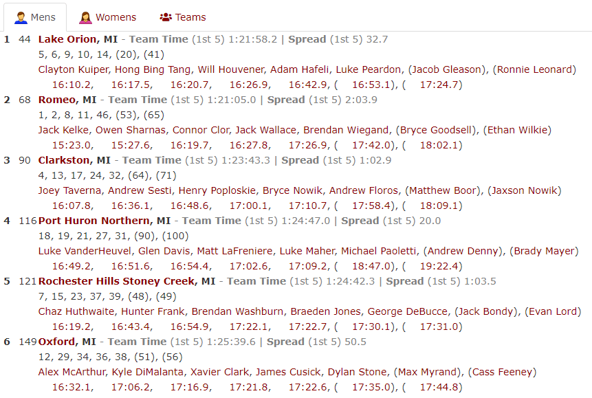 Romeo and Lake Orion’s boys are among the best in the state through 4 runners. For the Bulldogs, Bryce Goodsell outperformed expectations at Macomb County. Lake Orion’s 5th-7th runners have all brought it on separate days. Lake Orion has beaten Brighton, the state’s top team (albeit in a smaller field), so they’re 100% capable of great things. So look to see how these guys fare vs. the rest of the field and project that onto the following weekend.