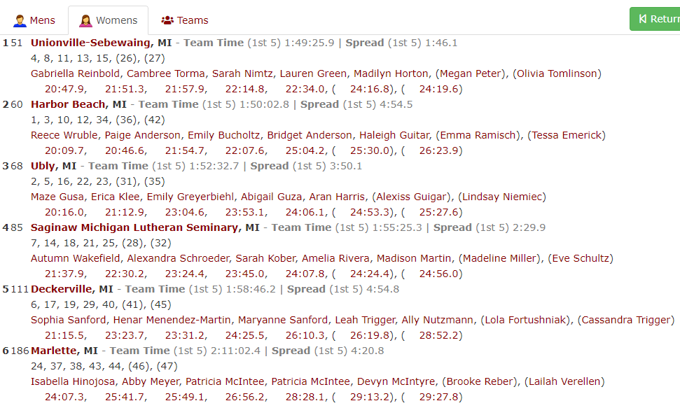 The battle for the third boys spot. Mayville and Ubly look to be equal through 3 runners, Mayville has the stronger 4 and weaker 5, while Ubly’s 4/5 are close.