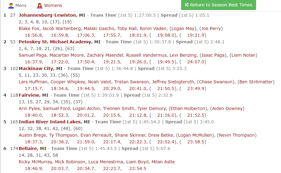 | 5 | 11 | Macartan Moore | Petoskey St. Michael | 169.5 |