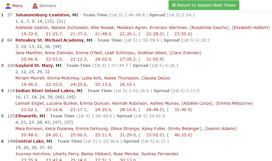 | 14 | 12 | Sara Decker | Lincoln-Alcona | 60.9 |