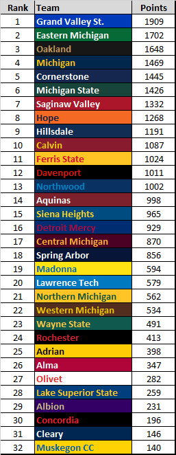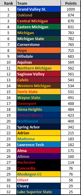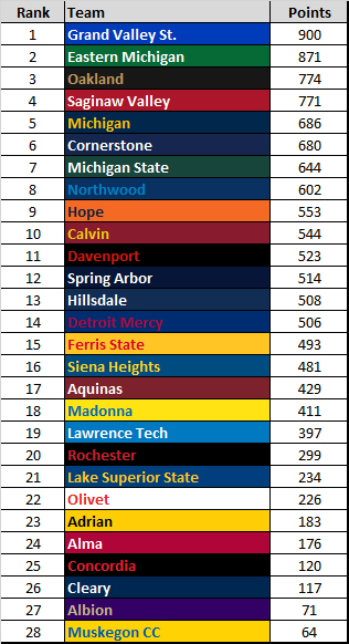 To recap the scoring method: “The scoring method follows the MITCA Power Rankings with a bit of my own twist. Four individual indoor distance events (800, Mile, 3k, 5k). The top 3 runners from each team score, with three events maximum for an individual. The scoring will go 90 places deep, with 90 points for the fastest mark, 1 point for the 90th fastest mark. Results come from TFRRS and are the fastest mark by an individual during this season.”