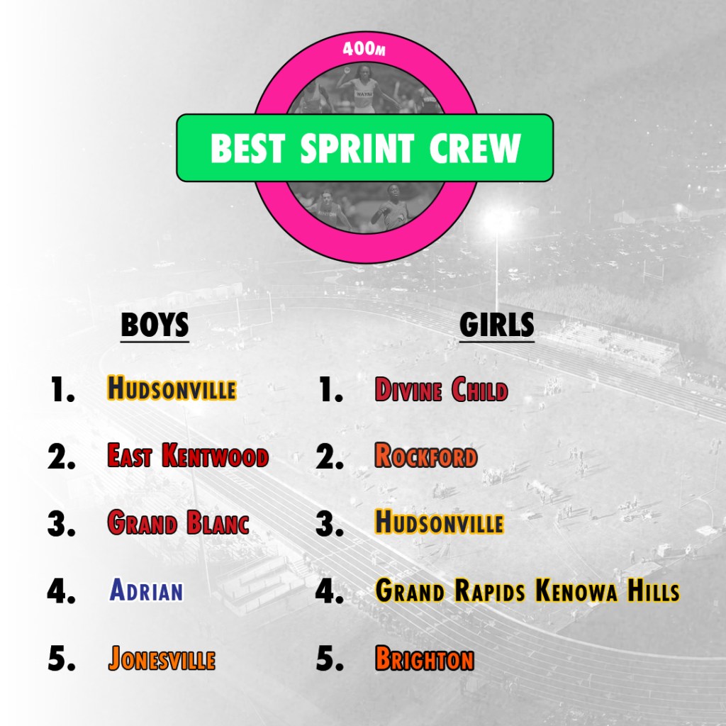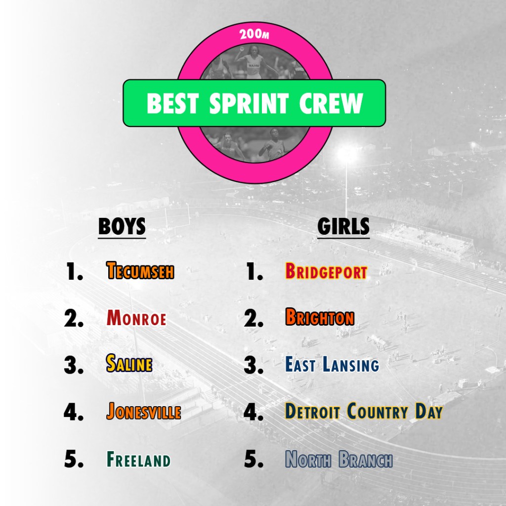 Rank Team Avg. Time 1 Tecumseh 23.35 2 Monroe 24.01 3 Saline 24.02 4 Jonesville 24.12 5 Freeland 24.14 6 Detroit Country Day 24.24 7 Portage Central 24.24 8 White Lake Lakeland 24.25 9 H.H. Dow 24.29 10 Davison 24.29 11 Detroit Catholic Central 24.44 12 Cadillac 24.5 13 Jackson 24.54 14 Flint Carman-Ainsworth 24.55 15 Swartz Creek 24.56 16 Ann Arbor Huron 24.61 17 Sparta 24.64 18 Brighton 24.68 19 Hillsdale 24.7 20 Adrian 24.78 21 Temperance Bedford 24.8 22 Linden 24.87 23 Mt. Pleasant 24.93 24 Kalamazoo Hackett 24.94 25 Ann Arbor Pioneer 24.99