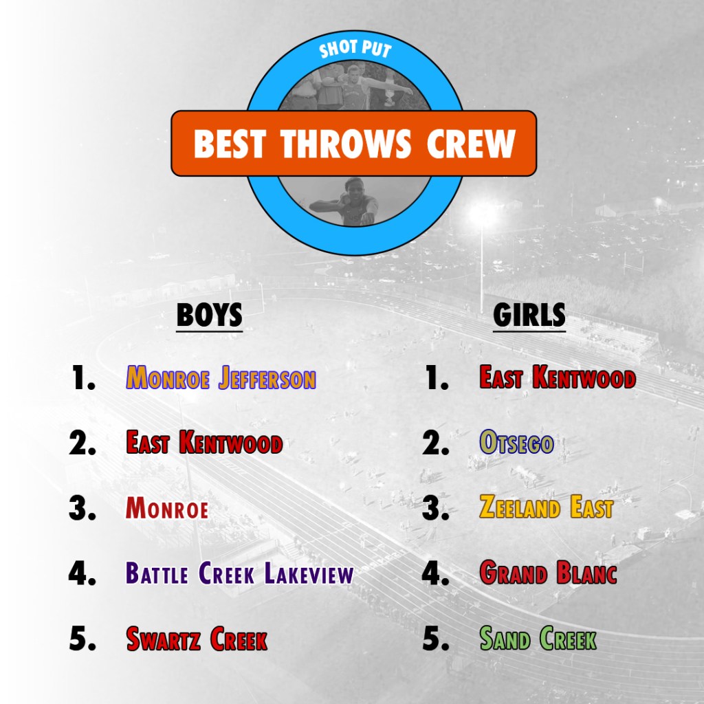 Rank Team Avg. Throw 1 East Kentwood 35′ 0.8″ 2 Otsego 33′ 9.3″ 3 Zeeland East 33′ 3.6″ 4 Grand Blanc 32′ 5.5″ 5 Sand Creek 31′ 10.6″ 6 North Branch 31′ 6.3″ 7 St. Joseph 31′ 4″ 8 Bloomfield Hills 30′ 7.1″ 9 Dexter 30′ 1.9″ 10 Zeeland West 29′ 8.8″ 11 Constantine 29′ 1.8″ 12 Monroe 29′ 1.3″ 13 Saginaw Swan Valley 29′ 0.6″ 14 Cadillac 28′ 11.6″ 15 Ypsilanti Lincoln 28′ 11.4″ 16 Monroe Jefferson 28′ 8.8″ 17 Temperance Bedford 28′ 5.9″ 18 Sparta 28′ 4″ 19 Battle Creek Lakeview 28′ 1.3″ 20 Montague 27′ 11.2″ 21 Middleville Thornapple-Kellogg 27′ 9.5″ 22 Hastings 27′ 7.8″ 23 Richland Gull Lake 27′ 5″ 24 Mattawan 27′ 2″ 25 Plainwell 27′ 1.4″