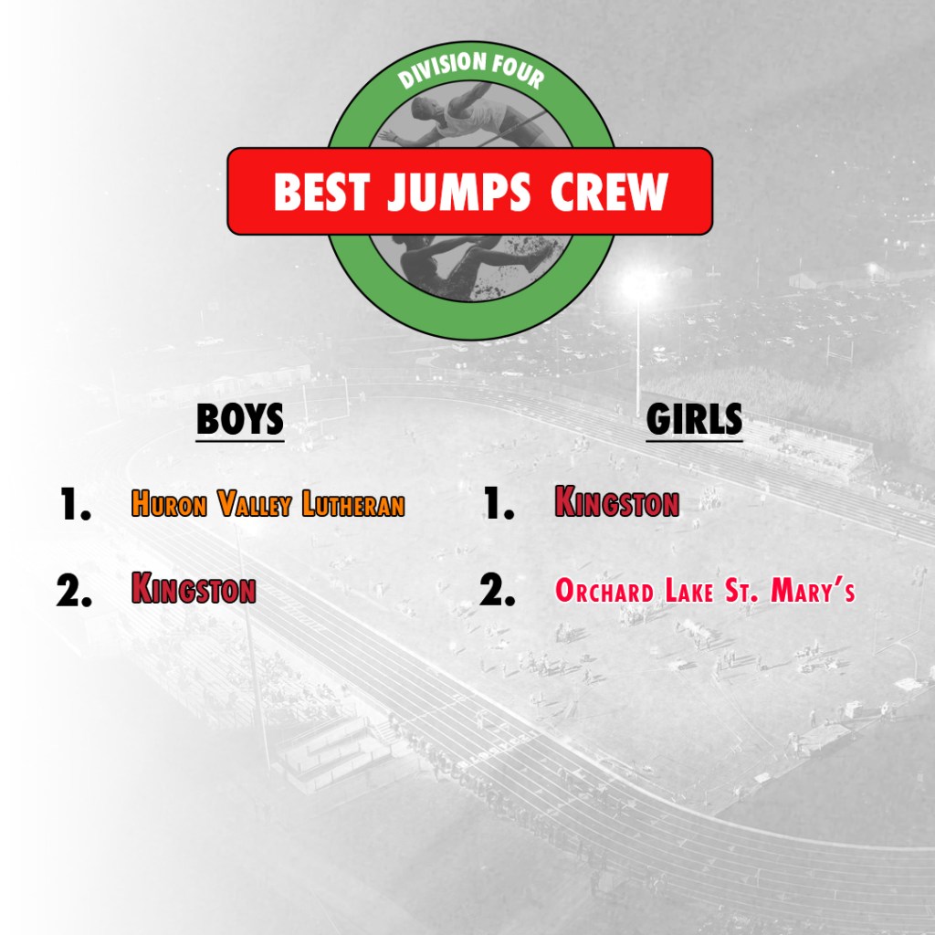 Rank Team Avg. Jump 1 Holt 20′ 10.17″ 2 Allendale 19′ 9.92″ 3 Holland West Ottawa 19′ 7.67″ 4 Battle Creek Lakeview 19′ 7.42″ 5 East Kentwood 19′ 6″ 6 Hillsdale 19′ 5.42″ 7 Detroit Catholic Central 19′ 3.33″ 8 Whitehall 19′ 1.75″ 9 Lake Orion 19′ 1.67″ 10 Okemos 18′ 11.92″ 11 Adrian 18′ 11″ 12 Saline 18′ 8.83″ 13 Brighton 18′ 8″ 14 Flint Powers Catholic 18′ 5.17″ 15 Warren DeLaSalle 18′ 4.83″ 16 Ortonville Brandon 18′ 3.58″ 17 Fruitport 18′ 3.5″ 18 Zeeland West 18′ 3.5″ 19 Hudsonville 18′ 3″ 20 Temperance Bedford 18′ 2.5″ 21 Chelsea 18′ 2.25″ 22 Davison 18′ 2″ 23 Coopersville 18′ 1.75″ 24 Gladwin 18′ 1.75″ 25 Grand Rapids Kenowa Hills 18′ 1.67″