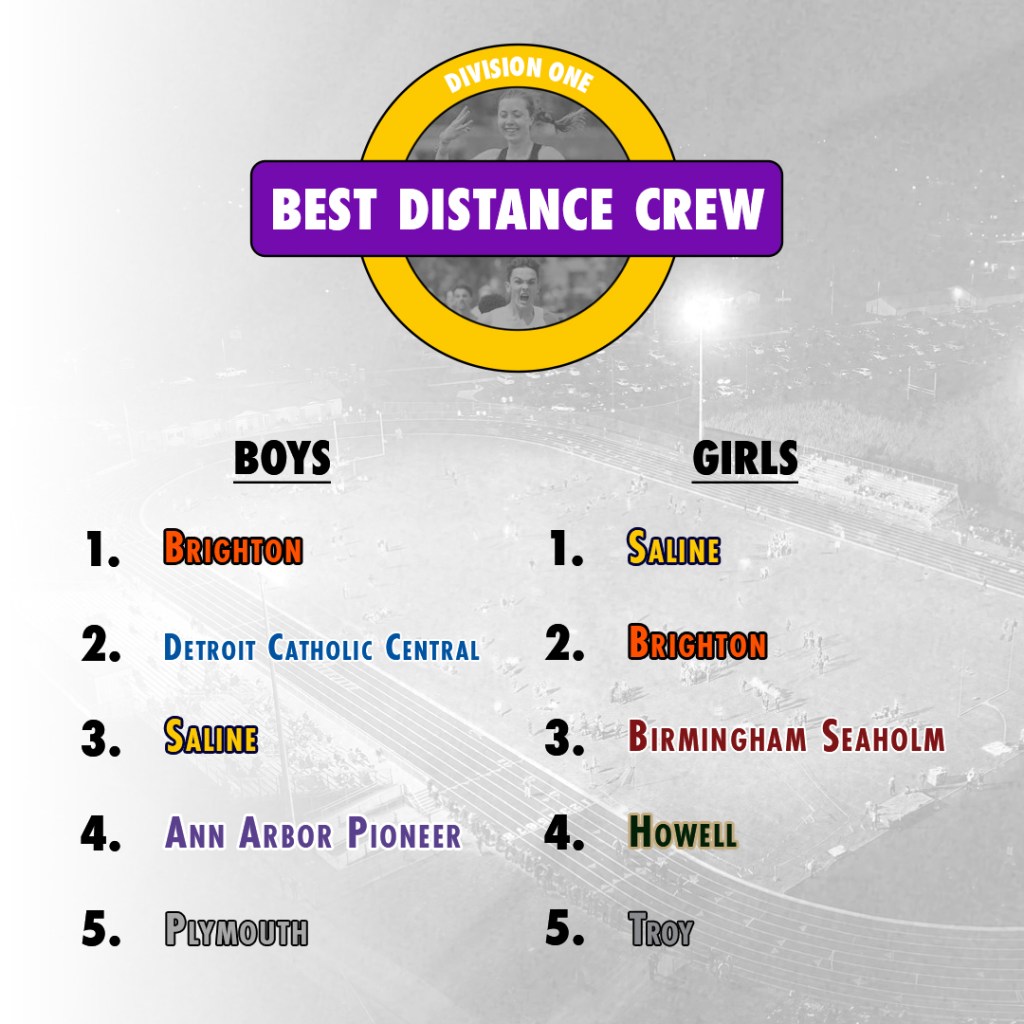 Rank Team 800m 1600m 3200m Total 1 Brighton 1 8 1 10 2 Detroit Catholic Central 3 7 3 13 3 Saline 12 1 5 18 4 Ann Arbor Pioneer 8 6 7 21 5 Plymouth 6 5 11 22 6 Livonia Churchill 17 3 6 26 7 Dearborn Divine Child 15 9 4 28 8 Adrian 14 4 12 30 9 Detroit U-D Jesuit 2 11 18 31 10 Linden 24 2 8 34 11 Troy 10 12 15 37 12 Farmington 11 15 13 39 13 Midland 18 20 2 40 14 White Lake Lakeland 4 29 10 43 15 Otsego 25 10 9 44 16 Chelsea 7 17 21 45 17 Lake Orion 20 13 19 52 18 Traverse City St. Francis 13 24 17 54 19 Monroe 16 16 23 55 20 Freeland 9 26 20 55 21 Hartland 5 23 33 61 22 Rochester Hills Stoney Creek 26 28 14 68 23 Dexter 41 14 16 71 24 Temperance Bedford 21 18 34 73 25 Rochester Adams 19 27 30 76
