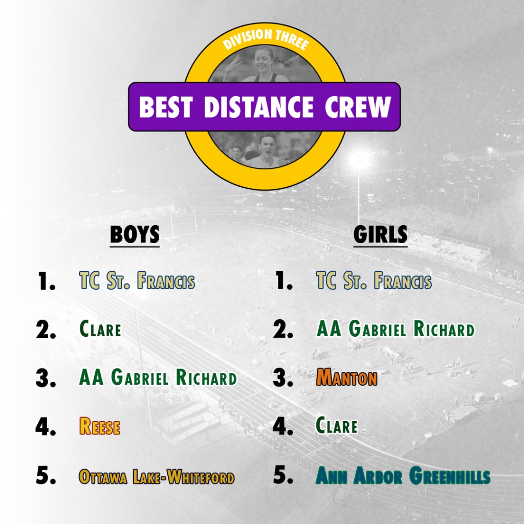 Rank Team 800m 1600m 3200m Total 1 Traverse City St. Francis 1 1 1 3 2 Ann Arbor Gabriel Richard 2 3 5 10 3 Manton 6 2 2 10 4 Clare 3 5 3 11 5 Ann Arbor Greenhills 4 4 4 12 6 Leroy Pine River 5 6 6 17