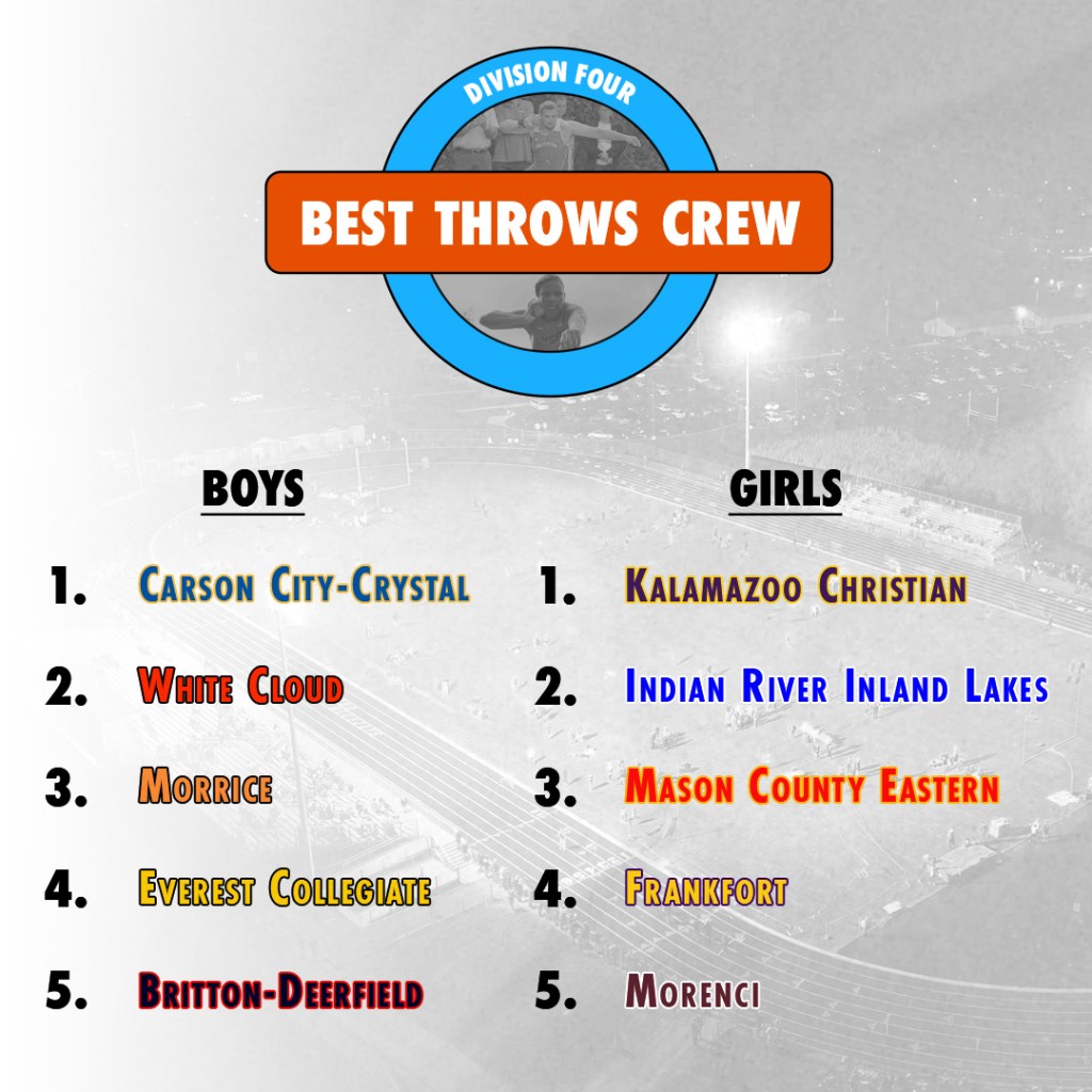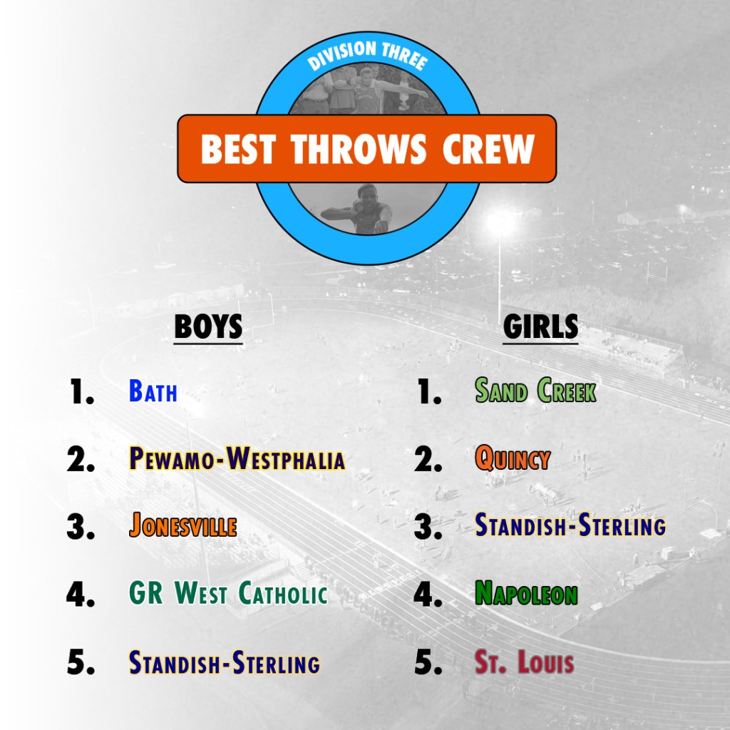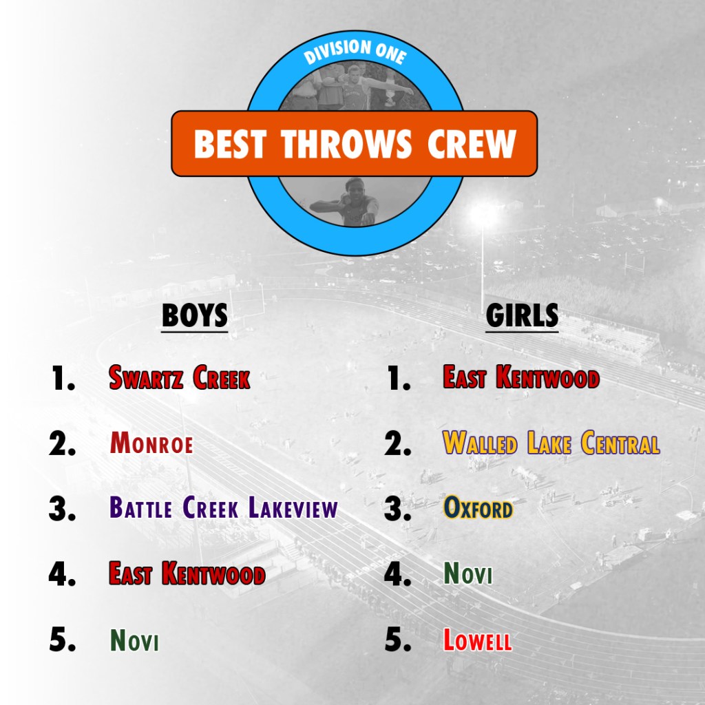 Rank Team Avg. Distance 1 East Kentwood 35′ 2.8″ 2 Zeeland East 33′ 9.7″ 3 Otsego 33′ 9.3″ 4 Livonia Stevenson 33′ 0.7″ 5 Grand Blanc 33′ 0.5″ 6 Oxford 32′ 6.8″ 7 Marysville 32′ 6.2″ 8 Middleville Thornapple-Kellogg 32′ 5.5″ 9 Sand Creek 32′ 3.9″ 10 North Branch 31′ 11.9″ 11 Lowell 31′ 8.1″ 12 Holt 31′ 6.2″ 13 Cadillac 31′ 4.5″ 14 St. Joseph 31′ 4″ 15 Walled Lake Central 31′ 1.3″ 16 Niles 30′ 10″ 17 East Lansing 30′ 8.8″ 18 Grandville 30′ 7.7″ 19 Bloomfield Hills 30′ 7.1″ 20 Novi 30′ 5.5″ 21 Quincy 30′ 5.3″ 22 Dexter 30′ 4.1″ 23 Lansing Waverly 30′ 3″ 24 Eaton Rapids 30′ 2.4″ 25 Standish Sterling 30′ 1.5″